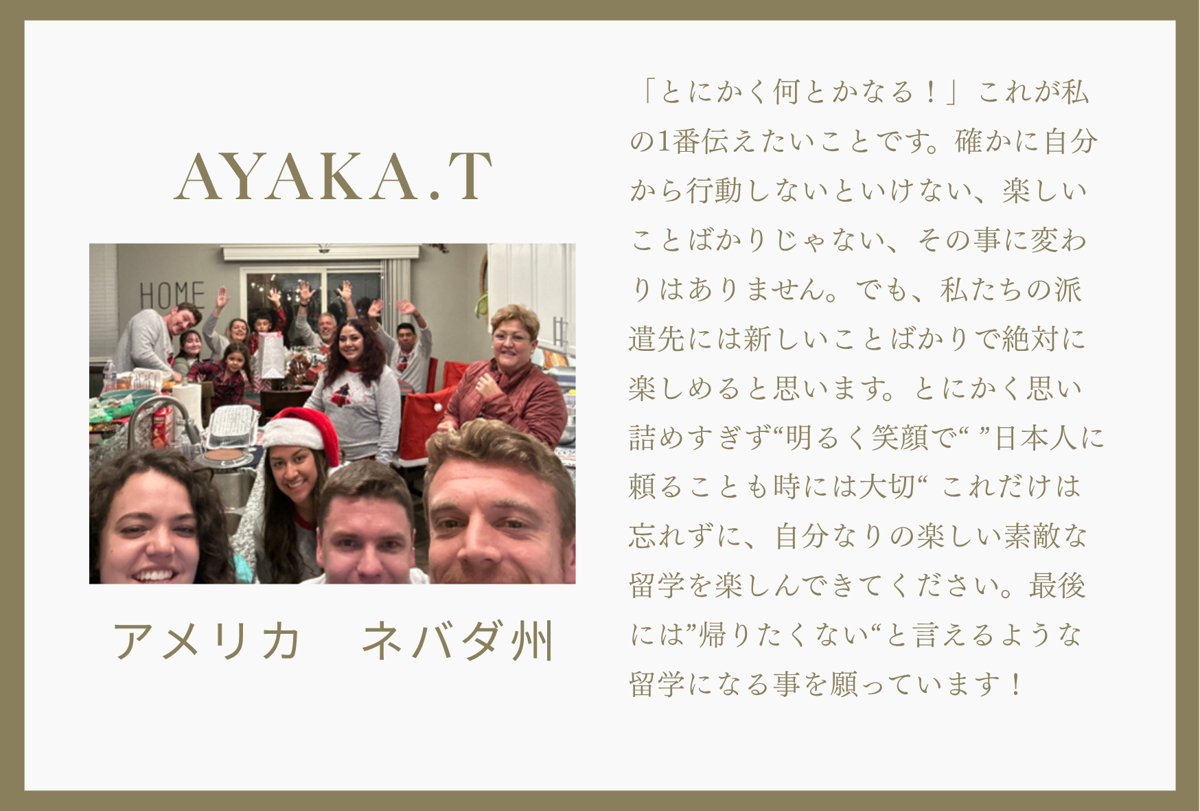 | 応募資格 | 健康状態が良好であること 在籍校の平均評定が5段階中3以上 英語レベル英検2~準1級ぐらい (渡航前に無料の英会話レッスンがあるため、不安でもまずはご相談ください) |
