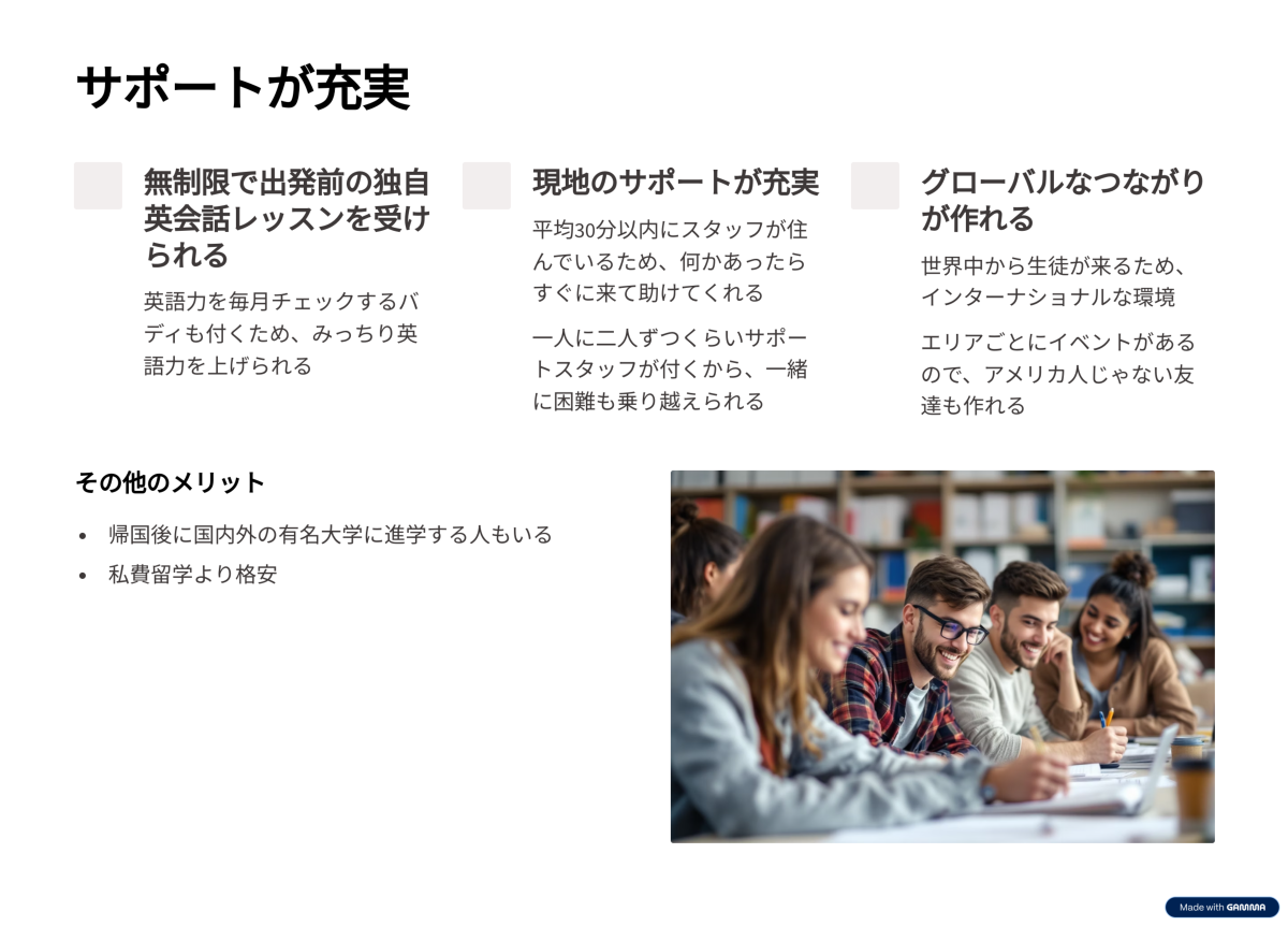 無制限で出発前の独自英会話レッスンを受けられ、バディ制で英語力を毎月チェックしてくれます。だから、英語力が無いように感じてもとりあえず問い合わせをしてみてください。出発前までにみっちり英語力を上げられます。